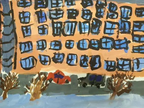 Этот дом стоит на моей улице. Я знаю, что он построен в стиле конструктивизм. Таких домов на моей улице очень много. Это район Дангауэровка. Я в нём родился. Я люблю свой район, поэтому нарисовал его.