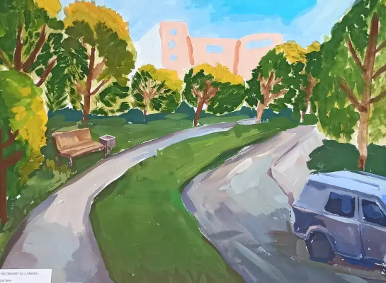 Сегодня нам с ребятами в лагере предложили нарисовать одно из мест нашего города. Я решила нарисовать место, где я гуляю, потому что мне очень нравится там гулять с родителями и друзьями.