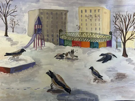 Приходу зимы я всегда радуюсь как ребенок. Как приятно выглянуть из своего окна и увидеть сугробы снега и теплое солнышко. Особенно, когда оттепель и снег становится мягким. Тогда весь наш двор наполняется детворой. А еще двор наполняется громким чириканьем птиц. Мне нравится наблюдать за ними.