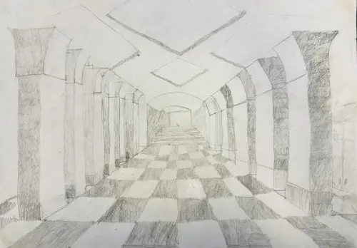 Максим трудился над своей работой не один день, сверяя получающийся рисунок с фотографиями «Кропоткинской» в интернете. Не забыл даже нарисовать поезд метро, стоящий у правого края платформы — на двери видна надпись «Не прислоняться».