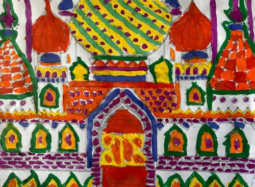 семьей мы очень любим гулять по центру Москвы, мне захотелось нарисовать Собор Покрова Пресвятой Богородицы на Рву. Собор выглядит как волшебный замок из сказки! У него есть много красивых башенок и золотой крест на крыше, который сверкает на солнце. Собор является одним из самых известных символов Москвы.