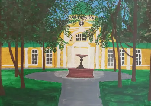 Эта усадьба находится в районе моего проживания. Мы часто там гуляем всей семьёй. На одной из погулок мы сделали фотографию центральной аллеи, которую я нарисовала на данной картине…