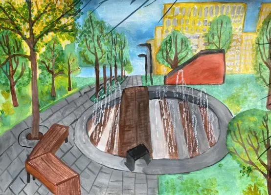 Моя работа посвящается моему району Некрасовка, в котором я живу, и самому красивому месту в нем — фонтану в городском парке. У нас в районе много красивых мест. Но фонтан я люблю больше всего!