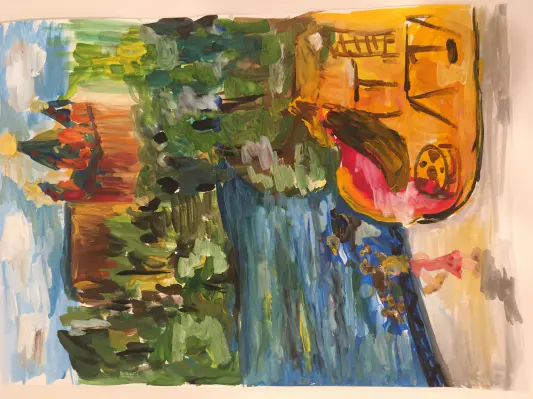 На работе нарисована любимая детская площадка, уточки с утятами и автор — девочка Оля, которая кормит птиц хлебом, в далеке — Храм Державной иконы Божией матери, окружённый парком.
