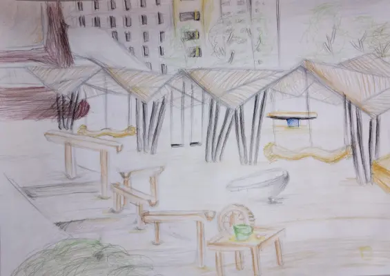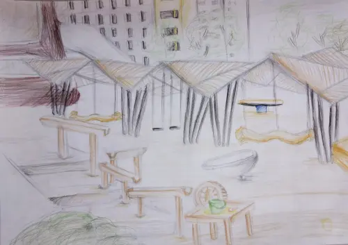 Зона с высокой башней и тарзанкой. Деревья на площадке молодые, под их тенью не укрыться, но есть теневой навес.Я изобразила детскую площадку, она называется «Оригами» находится в моём ЖК Саларьево парк. Площадка поделена на игровые зоны: Водная зона с двумя ручьями. В одном из них поток воды непрерывный, во втором ручье для подачи воды нужно покрутить диск.