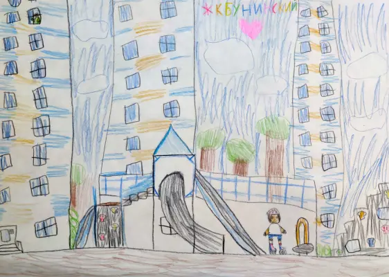 Здравствуйте. Меня зовут Вика. Мне 7 лет. В этом году я иду в первый класс. Я нарисовала свой любимый двор, где гуляю со своими друзьями. В нашем дворе много всего интересного. Но больше всего нравится горка! Она очень высокая и с неё очень круто съезжать! Я умею кататься на велосипеде и самокате, а сейчас учусь кататься на роликах! У меня рекорд — я прокатилась десять кругов и только два раза упала!