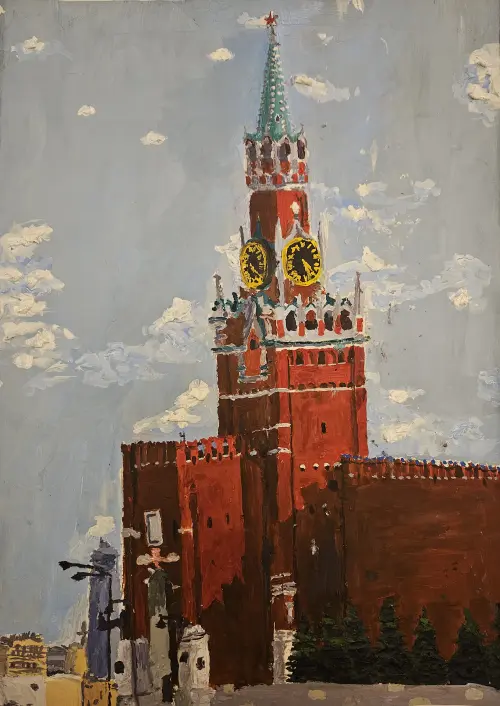 При создании работы я вдохновилась одной из самой популярной достопримечательности нашей столицы, которая находиться на Красной Площади — это Спасская башня. Мне очень нравятся прогулки по центру нашего города.