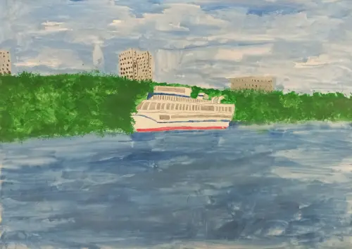 Я очень любознательный, т.к. мои родители любят путешествовать и бывать в разных красивых местах. Однажды мы решили прокатится на теплоходе, мне так понравилось, что я даже захотел стать моряком, а прийдя домой нарисовал вот такую красивую картину. Теперь она висит у меня в комнате, я ей любуюсь и мечтаю, что когда я стану взрослым — отправлюсь в круиз.