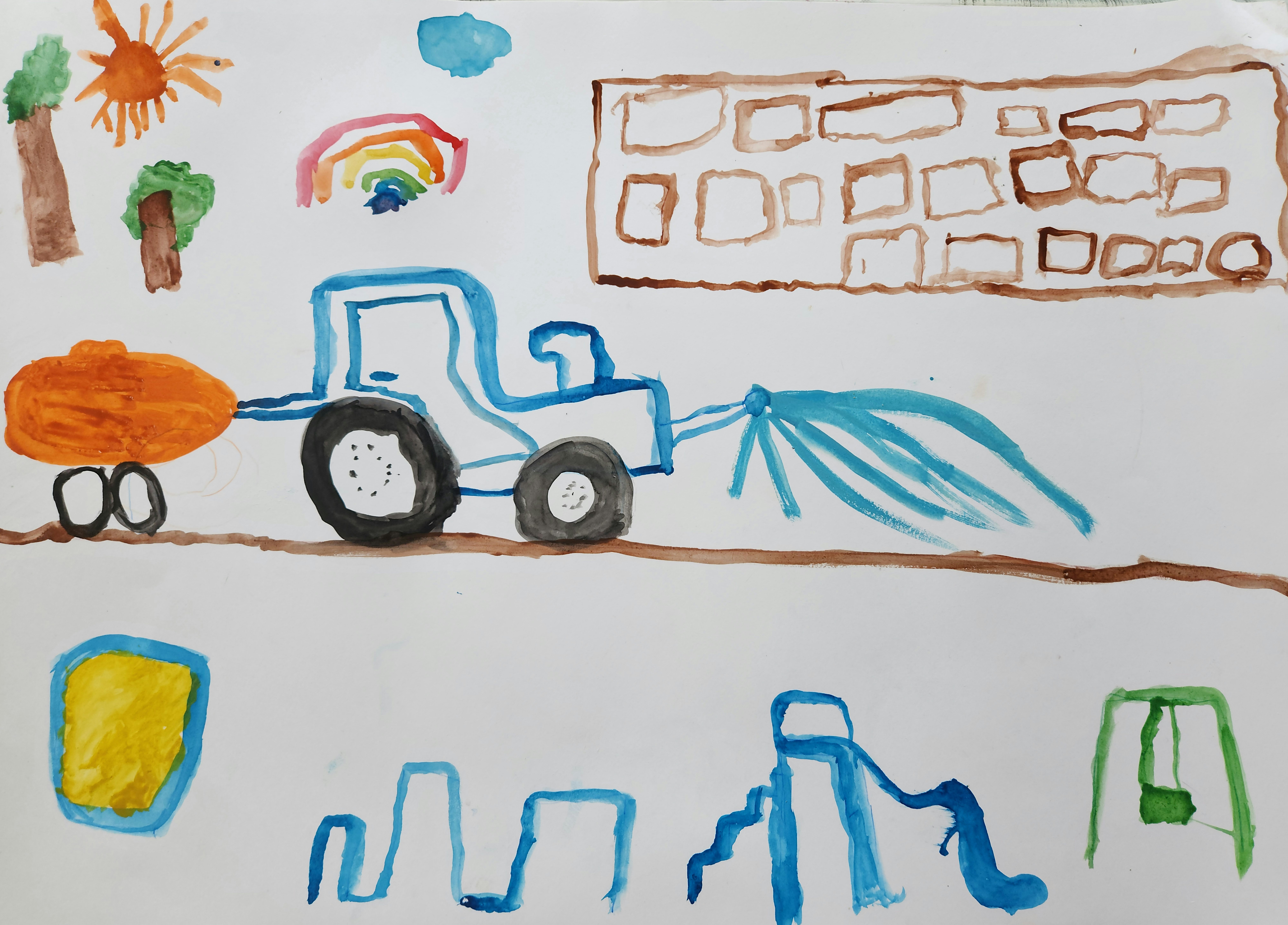 Сын любит гулять на улице, играть на площадке (заниматься в песочнице строительством, висеть и переворачиваться на турнике, кататься с горки, и конечно же качаться на качелях). Очень любит тракторы, которые поддерживают чистоту в жилых зонах. Всё это Филипп и нарисовал, наш двор.