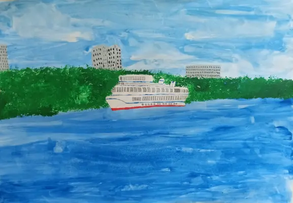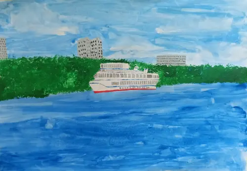 Мы гуляли с мамой и папой по набережной в нашем парке. Я увидел большой корабль и очень захотел его нарисовать. На следующий день в саду я рассказал о своих впечатлениях и мы нарисовали этот рисунок.