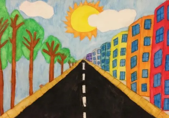 Улица любимого города! Город изображен приветливо и солнечно! Улица любимого города! Город изображен светло, приветливо! В городе красочные дома и много зеленых насаждений! Большой частью картины является солнце- что говорит о том что настроение в позитивное! Улица любимого города! Город изображен светло, приветливо! В городе красочные дома и много зеленых насаждений! Большой частью картины является солнце- что говорит о том что настроение в позитивное!