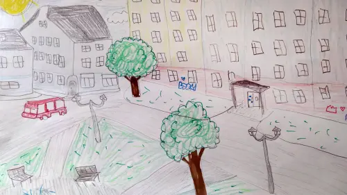 На детском рисунке под названием «Моя улица» изображен двор с фонтанчиком. Рядом припаркованы машины, сам двор очень зеленый, на его территории высажены величественные деревья