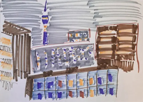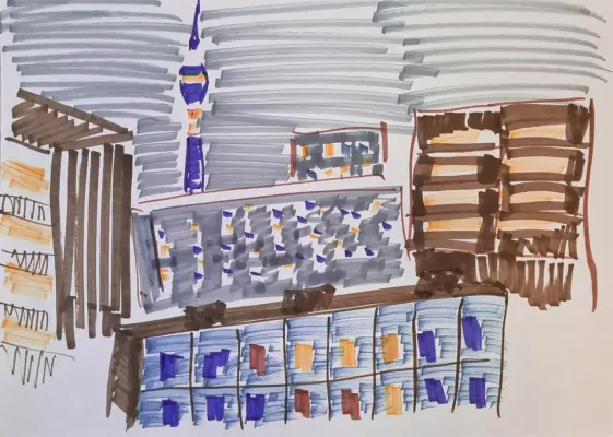 На рисунке изображён ночной район, залитый мягким светом фонарей. В центре композиции возвышается Останкинская башня, её силуэт выделяется на фоне тёмного неба. Вокруг башни раскинулся город, в окнах домов мерцают огни.
