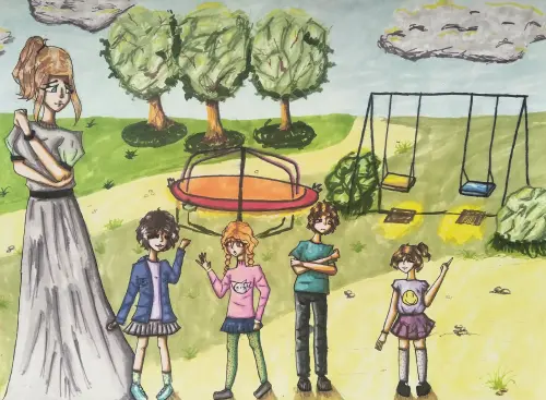 На рисунке изображена детская площадка, расположенная во дворе. На ней есть качели, горки, турники и другие аттракционы. Дети разных возрастов играют во дворе. Рядом с площадкой растут деревья и цветы, создавая уютную атмосферу.
