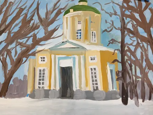 В нашем районе есть старинная усадьба. Мой брат Дима нарисовал один из домов, а мне нравится церковь, которая тоже принадлежит к постройкам усадьбы. Эта церковь никогда не закрывалась, даже во время СССР.