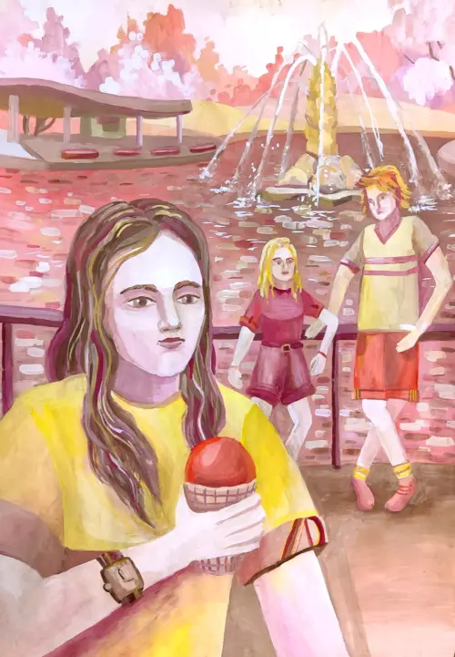 На картине я изобразила встречу трех друзей у фонтана «Колос», в этот момент они обсуждают, куда хотят пойти, выбор огромен, от музеев до интерактивных выставок и мастер-классов. Когда выставки меняются, они снова возвращаются, а иногда просто гуляют по огромной территории парка, обсуждая научные открытия и книги. И каждый раз открывают для себя что-то новое на прогулке по ВДНХ.