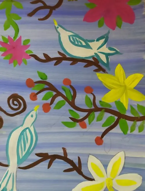 Двор, которай находится возле нашего дома очень красивый, зелёный и уютный. В нашем дворе растут яблони, одна вишня и кусты жасмина. Вот уже несколько лет, когда расцветает жасмин к нам во двор прилетают красивые птицы, мы ими любуемся. Я решила их нарисовать.