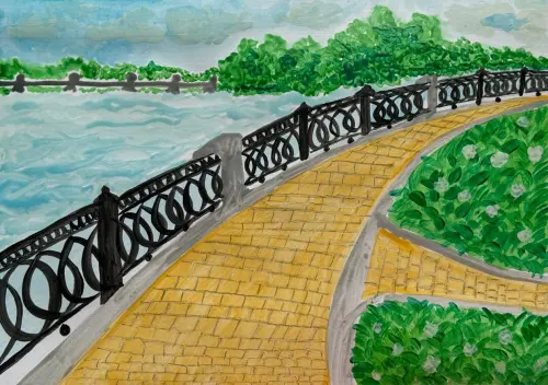 Наш район — Нагатинский затон, и в нём самые красивые набережные, у нас их целых две. Нам так повезло, ведь мы живем на одной из них и регулярно гуляем и катаемся на самокатах. На картине изображена наша любимая набережная.