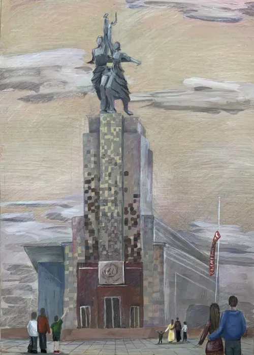 На этой работе я изобразила памятник «Рабочий и колхозница» Веры Мухиной не просто так, а из-за того, что именно эта достопримечательность является моей любимой. Все потому что она отображает всю любовь к труду.