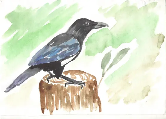 Я люблю гулять с фотоаппаратом по разным интересным местам в Москве и недавно была в Ботаническом саду. В глубине парка увидела ворона, сидящего на пеньке. Он был один и очень серьезный. Надеюсь, у него всё хорошо.