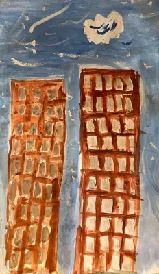 Я нарисовал свой любимый дом. Такие высокие дома напоминают мне замок. Мне очень нравится смотреть из своего окна во двор. А еще мне нравится гулять среди этих башен. Я очень люблю свой район.