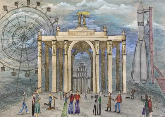 На своей работе я хотела запечатлеть самые знаковые достопримечательности ВДНХ: колесо обозрения, ракета-носитель «Восток» и главный вход. На переднем плане расположены люди, которые фотографируются, играют или просто прогуливаются по площади. Я думаю, мне удалось передать величественность и красоту этой выставки.