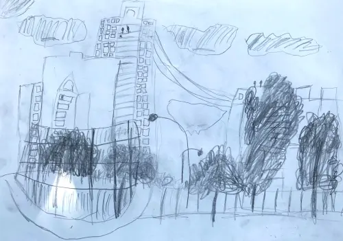 Рисунок изображает поселок Севводстрой. Рисунок выполнен в карандашной технике ребенком самостоятельно, используя собственное видение картины мира.