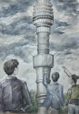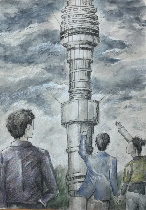 На своей работе я нарисовал Останкинскую башню. Я решил изобразить именно ее, так как я сам восхищаюсь ее величием и внешним видом. На башню смотрят люди, которые так же восхищаются ей.