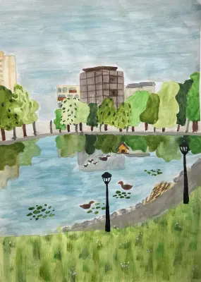 Я нарисовала мое любимое место в парке. Это пруд, в котором плавают уточки. Мы с семьей часто гуляем там и любуемся природой. Я нарисовала мое самое любимое место в парке. Это пруд Бекет, в котором плавают утки. Мы всей семьей часто гуляем там и любуемся природой. Я нарисовала мое самое любимое место в парке. Это пруд Бекет, в котором плавают утки. Мы всей семьей часто гуляем там, любуемся природой и просто отдыхаем.