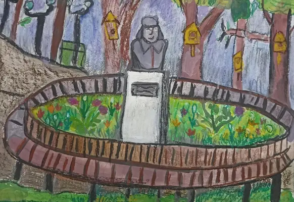 Мы каждый день гуляем в Бабушкинском парке, поэтому решили нарисовать памятник человеку, в честь которого назван парк, так же на изображение видны скворечники, которые мы изготовили ко Дню птиц!