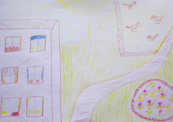 Мой любимый двор, где я гуляю со своей собакой. Там много зелени, цветов и солнца. Мне нравится тут гулять и проводить время со своей семьёй!