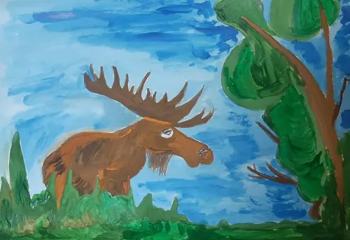 Гуляя в национальном парке «Лосиный остров», который расположен в нашем районе, произошла невероятная встреча с лосем. Я была под таким впечатлением, что решила запечатлеть его на своем рисунке.
