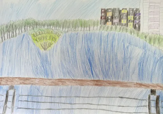 Я нарисовал Большой Южный пруд, потому что каждый день вижу его из окна. Он прекрасен в любое время суток, особенно на закате. Растут вокруг пруда дикие желтые ирисы и разные деревья.