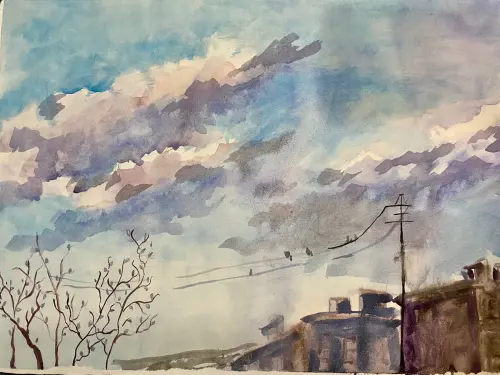 На картине изображено туманное утро в Ростокино. Солнце, еще не взошедшее, крадется за густым, белым покрывалом тумана, которое окутывает все вокруг, словно легкий, пушистый шарф.