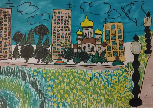 «Ростокино, мой район» — так называется картина, на которой перед вами раскинулся уютный и знакомый пейзаж. В центре — величественный храм Кирилла и Мефодия, окруженный зеленой листвой старых деревьев. Его золотые купола блестят на солнце, а белоснежные стены выглядят особенно яркими на фоне синего неба.