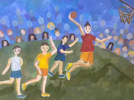 На картине изображена игра в баскетбол. Это увлечение нашего класса. В районе есть классные площадки, где мы проводим много времени, занимаемся спортом.На картине изображена игра в баскетбол. Это увлечение нашего класса. В районе есть классные площадки, где мы проводим много времени, занимаемся спортом.