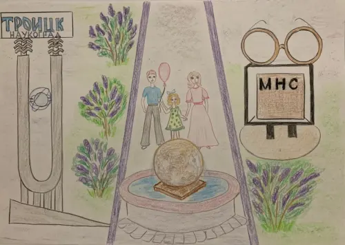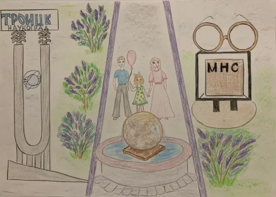 Я живу в городе Троицке. Мне очень нравится гулять с родителями у фонтана, а ещё у нас есть памятник младшему научному сотруднику. Этот памятник носит очки.