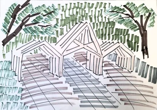 Я люблю рисовать архитектуру, которая вдохновляет меня своими формами и сочетаниями. В парк Лианозовский недавно сделали красивый вход и теперь на Лианозовский променад можно войти, полюбовавшись этой аркой.