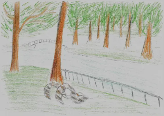 Меня вдохновил пруд на рисунок такой картины, я люблю сидеть на таких скамейках, читать книги и слушать звуки природы. Иногда я прихожу сюда послушать птиц и порисовать небольшие картинки.