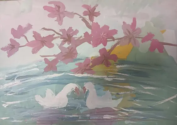 Мне кажется лебеди самые красивые птицы на земле. Очень интересно смотреть, как они плавают в пруду. Каждый, кто хоть раз видел этих птиц, навсегда запомнит их грацию и красоту. Именно это я попыталась передать в своей работе.
