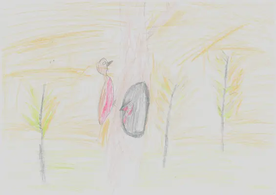 Я люблю гулять по парку и смотреть на высокие деревья и красивые травинки. Я увидела, как дятел сидит на дереве, и мне очень понравилось, поэтому я нарисовала эту картину.