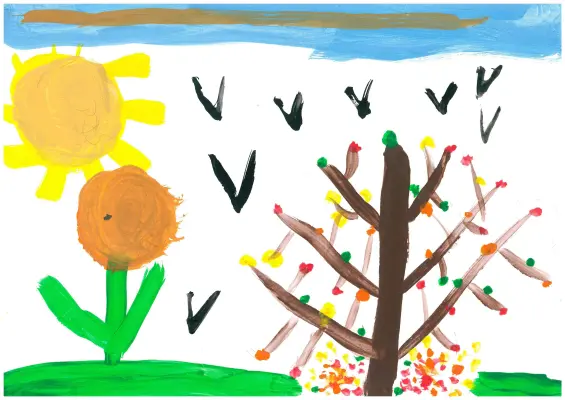 Мы гуляем с родителями по парку и они показывают мне, как красиво ближе к осени с деревьев падают разноцветные листья, похожие на игрушечные из-за их цветов. Я люблю летом гулять по Лианозовскому парку и смотреть на эти деревья, ожидая, когда с них будут падать красивые листочки.