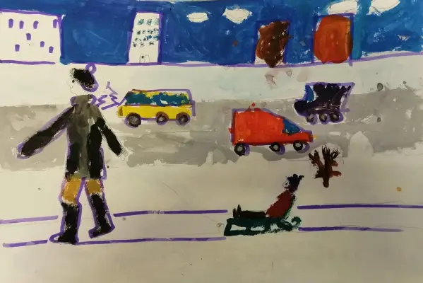 Я очень люблю зиму: кататься на коньках, лыжах, санках, с горки. Я нарисовала этот рисунок потому что люблю зиму и свой город зимой. На рисунке папа везет меня в санках по Ярославскому шоссе.