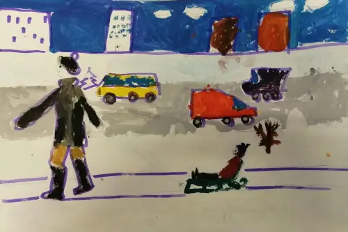 Я очень люблю зиму: кататься на коньках, лыжах, санках, с горки. Я нарисовала этот рисунок, потому что люблю зиму и свой город зимой. На рисунке папа везет меня в санках по Ярославскому шоссе.