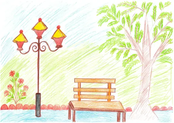 Я катался на самокате на Ясном пруду и присел на лавочку, чтобы отдохнуть. Было очень красиво, природа говорила со мной птичьими голосами. Мое внимание привлек фонарь с завитушками. Когда я пришел домой, то нарисовал картину с моими впечатлениями.
