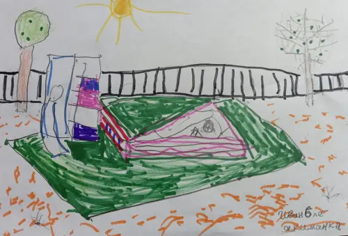 Я люблю гулять во дворе. Там у меня друзья. Дима, Настя и Джеф. Летом нам сделали новую горку, качели и песочницу. Рисовать я не умею, но захотел участвовать в конкурсе, Вот посмотрите, какая красивая у нас теперь детская площадка. Спасибо.
