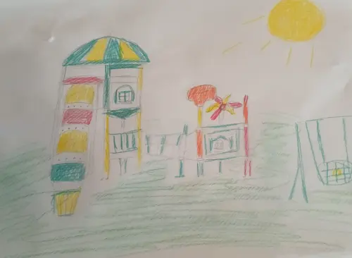 Я очень люблю гулять на этой площадке вместе с мамой и со своими сестрёнками, мне интересно гулять на этой площадке на ней есть много интересного. Я не умею ещё все рисовать, поэтому нарисовал горку и качели.