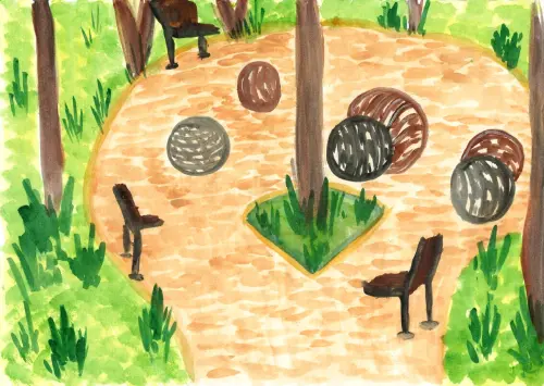 В нашем районе самое красивое место — это парк у пруда «Марс», там качели, спортивные площадки, я люблю там играть. А ещё там лежат огромные шары, они олицетворяют солнечную систему, вокруг них стоят скамейки, моя мама любит там отдыхать.