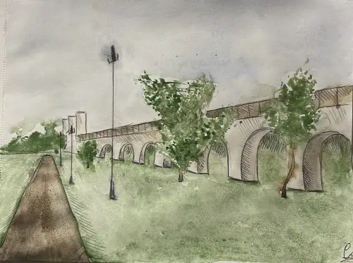 Данная работа выполнена акварельными красками и чёрной шариковой ручкой. Картина олицетворяет красоту Московских пейзажей, акведука, что не может не радовать.