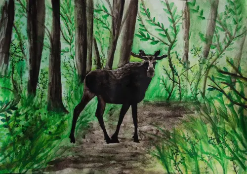 Я живу в Ярославском районе. Мой дом прямо у заповедника Лосиный остров. Там очень красивая природа и много животных. Я нарисовал лося — символ и главное животное заповедника. Я часто там гуляю и несколько раз встречал их